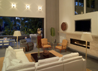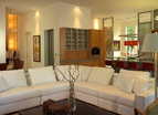 Other unique features include 12’ high ceilings, a 10’ high pocketing slider door to the backyard, polished concrete and cork flooring, concrete countertops and feature walls in kitchen and baths, stainless and bamboo panels flanking the breakfast nook entrance, a ‘mirror-style’ overflow swimming pool, lava-rock driveway and porch, lush bamboo and mature-palm landscaping, and a state-of-the-art electronic programmable control system allowing complete ‘touch-of-the-button’ control of lighting, air conditioning, shades and sound system throughout the home.