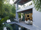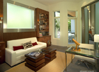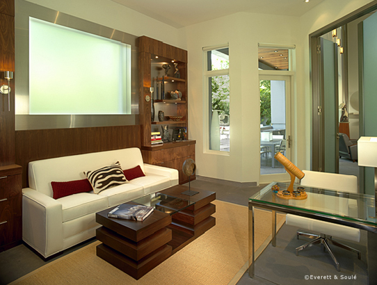 Other unique features include 12’ high ceilings, a 10’ high pocketing slider door to the backyard, polished concrete and cork flooring, concrete countertops and feature walls in kitchen and baths, stainless and bamboo panels flanking the breakfast nook entrance, a ‘mirror-style’ overflow swimming pool, lava-rock driveway and porch, lush bamboo and mature-palm landscaping, and a state-of-the-art electronic programmable control system allowing complete ‘touch-of-the-button’ control of lighting, air conditioning, shades and sound system throughout the home.