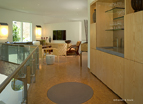 In the foyer, an open-riser, cantilevered-tread concrete staircase was custom-designed with a corner landing from which four corner steps appear carved out of the concrete base. Glass railing with stainless steel posts complement the impressive ‘floating’ stairs and surround the entire upstairs loft area.