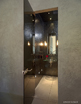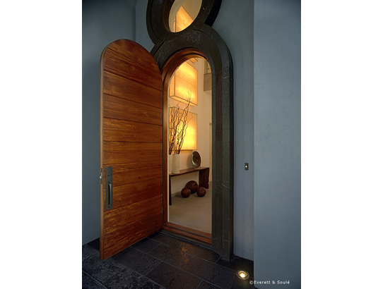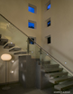 In the foyer, an open-riser, cantilevered-tread concrete staircase was custom-designed with a corner landing from which four corner steps appear carved out of the concrete base. Glass railing with stainless steel posts complement the impressive ‘floating’ stairs and surround the entire upstairs loft area.