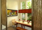 Other unique features include 12’ high ceilings, a 10’ high pocketing slider door to the backyard, polished concrete and cork flooring, concrete countertops and feature walls in kitchen and baths, stainless and bamboo panels flanking the breakfast nook entrance, a ‘mirror-style’ overflow swimming pool, lava-rock driveway and porch, lush bamboo and mature-palm landscaping, and a state-of-the-art electronic programmable control system allowing complete ‘touch-of-the-button’ control of lighting, air conditioning, shades and sound system throughout the home.