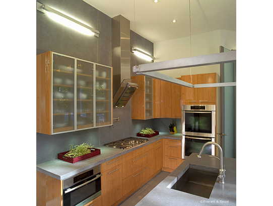 In the foyer, an open-riser, cantilevered-tread concrete staircase was custom-designed with a corner landing from which four corner steps appear carved out of the concrete base. Glass railing with stainless steel posts complement the impressive ‘floating’ stairs and surround the entire upstairs loft area.
