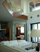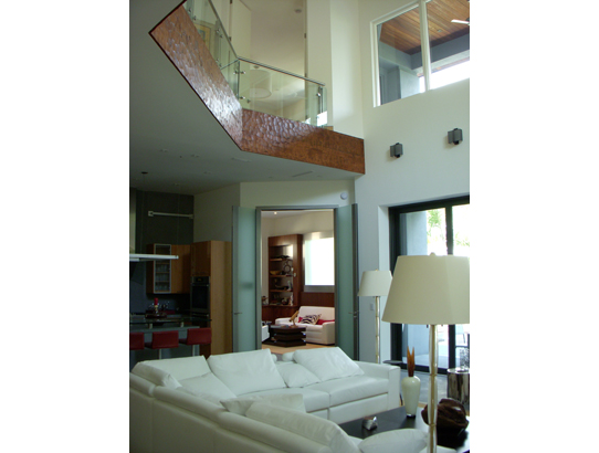 In the foyer, an open-riser, cantilevered-tread concrete staircase was custom-designed with a corner landing from which four corner steps appear carved out of the concrete base. Glass railing with stainless steel posts complement the impressive ‘floating’ stairs and surround the entire upstairs loft area.